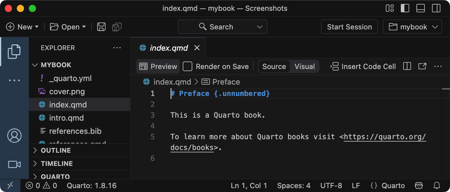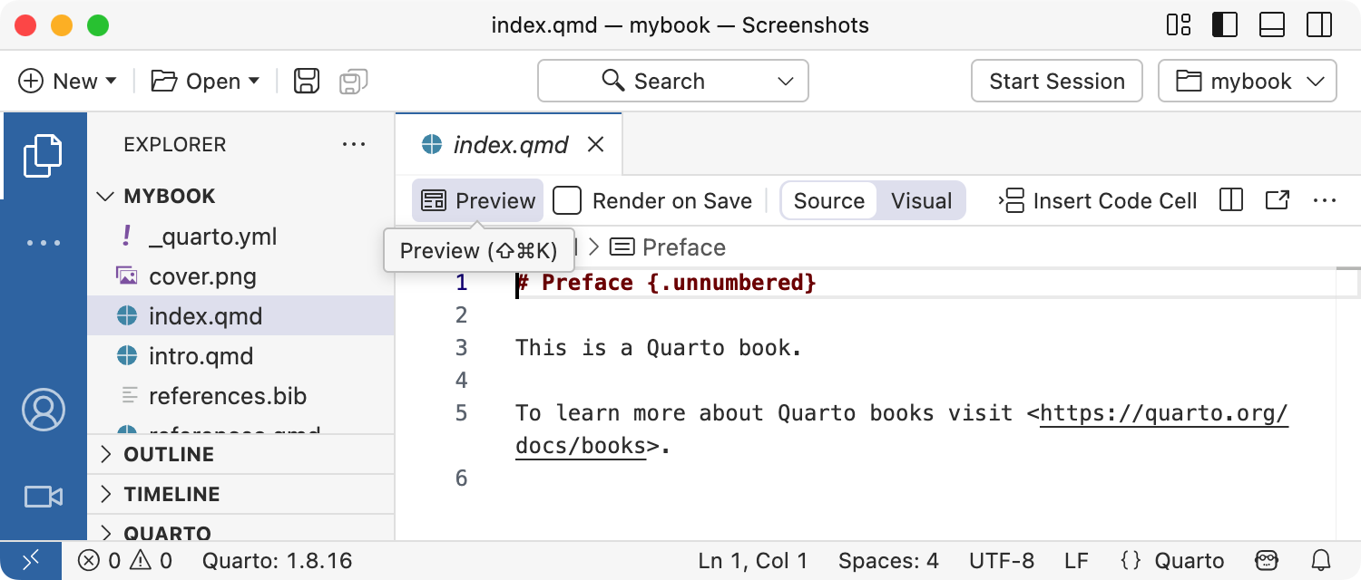 quarto create project book mybookThis will create the scaffolding for a simple book in the mybook sub-directory. Use the quarto preview command to render and preview the book: