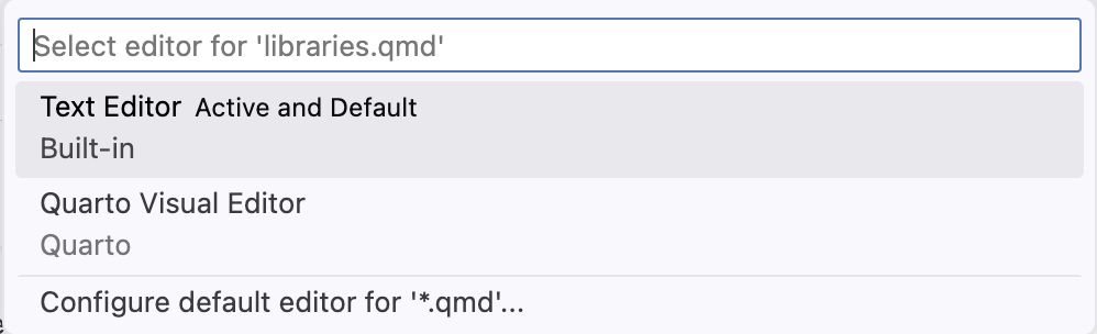 Note that this menu also provides an option to configure the default editor for .qmd files: use this if you want to primarily edit in visual mode and occasionally switch to source mode.