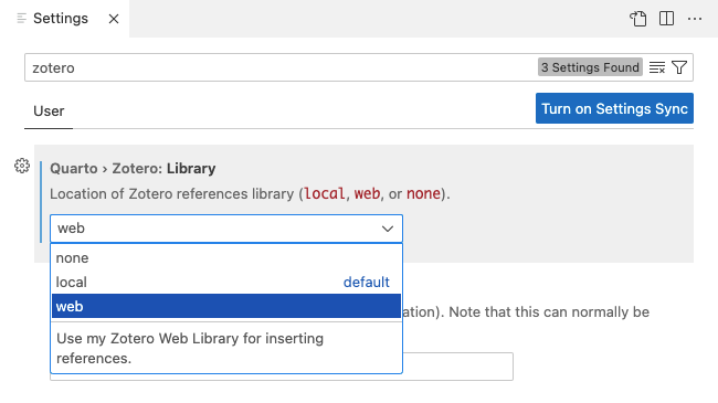 Finally, go to Zotero settings and specify that you’d like to use your web Zotero library rather than a local one: